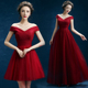 2017新款缎面礼服裙蕾丝一字肩新娘敬酒服修身短款聚会晚礼服酒红