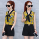 雪纺衫女夏2017新款韩版修身显瘦无袖V领蝴蝶结碎花雪纺上衣女装