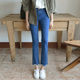 春装浅蓝色复古薄款小微喇直筒裤修身中高腰韩版开叉九分牛仔裤女