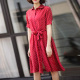高端真丝连衣裙波点夏季100桑蚕丝复古高腰红色短袖中长款衬衫裙