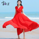 雪妃黛2017春夏女装新品修身显瘦女红色连衣裙长款雪纺海边沙滩裙