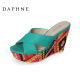 Daphne/达芙妮 夏新款高跟凉拖抽象花布坡跟一字型增高凉鞋女