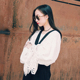 帅气仙女~菠萝草莓镂空刺绣喇叭袖白色衬衣+纽扣装饰背带长裤套装
