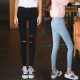 2016秋季高腰破洞黑色牛仔裤子女九分裤弹力修身小脚裤显瘦铅笔裤