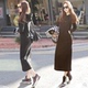 香港代购夏季韩版性感露肩一字领吊带连衣裙中长款时尚修身短裙子