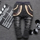 2016冬款新款儿童加绒牛仔裤黑色男童女童韩版小脚裤镶皮中童潮酷