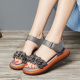 五言诗复古凉鞋女夏2017新款一字带真皮花朵休闲中跟厚底坡跟凉鞋
