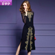 菲梦伊2016秋冬新款网纱长袖刺绣连衣裙修身中长款性感开叉裙9632