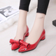 2017时尚单鞋女浅口皮鞋粗跟女鞋中跟尖头蝴蝶结高跟鞋套脚工作鞋