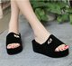 2017款女夏绒面松糕厚底坡跟一字拖鞋黑白色女外穿中高跟凉拖鞋女