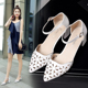 凉鞋女夏2017新款镂空包头透气女鞋尖头粗跟中跟一字扣带高跟鞋女