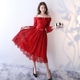 2017新款敬酒服短款时尚一字肩中袖红色连衣裙性感结婚晚礼服女夏