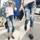 个性破洞卷边小直筒牛仔裤女九分韩国宽松帅气磨破做旧乞丐裤潮