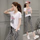 时尚套装女夏2017新款气质潮短袖T恤搭配条纹棉麻七分裤两件套