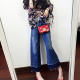 『水家出品』17春街拍竖条纹高腰不规则贴边毛边九分喇叭牛仔裤
