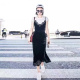 『水家出品』17早春竖条纹显瘦高腰开叉吊带裙连衣裙
