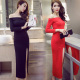 盈可人春季性感露肩夜店一字领气质长袖连衣裙长裙开叉修身晚礼