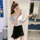 夏女装新款韩版短袖网纱拼接雪纺衫上衣蝴蝶结学生露肩打底衬衫女