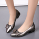 女鞋拼色粗跟浅口2017春夏新款真皮中跟单鞋牛漆皮尖头鞋子女皮鞋