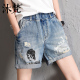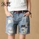沐梵2017印花破洞牛仔短裤卷边显瘦直筒三分裤松紧腰宽松大码热裤