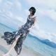 海边度假修身改良青花瓷连衣裙侧开叉树叶子印花吊带长裙沙滩裙蓝