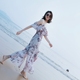 田园风五分袖印花交叉露背雪纺连衣裙仙气薄款系带海边度假沙滩裙