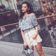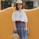 SLYMOUSY甜美花朵收腰露肩一字领系带短款雪纺衫