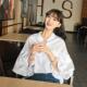 春装新款宽松条纹灯笼袖百搭学生休闲上衣衬衫女韩范环扣V领衬衣