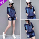 欧洲站2017春装新款宽松时尚牛仔套装连帽打底衫徽章短裤两件套
