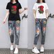 胖MM夏装大码女装绣花短袖T恤套装胖妹妹欧美九分牛仔裤两件套潮