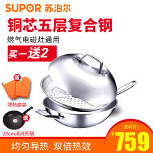 苏泊尔炒锅五层复合不锈钢铜芯炒菜锅CC32G1无涂层电磁炉通用32cm