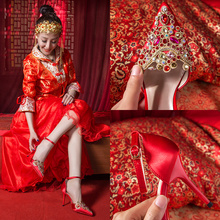 水晶婚鞋新娘鞋高跟防水台绑带尖头伴娘鞋单鞋红色水钻婚纱结婚鞋