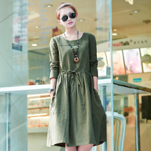 2016春季新款棉麻女装 文艺范收腰长裙森女系大码修身长袖连衣裙