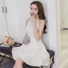 2017夏装新款时尚气质名媛珍珠挂脖钩花露肩修身显瘦a字连衣裙女