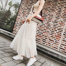 2017夏装时尚新款中长裙仙女网纱拼接木耳边蓬蓬裙半身裙大摆裙女