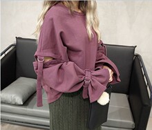 2016秋冬新款女韩国宽松圆领套头破洞长袖卫衣调节荷叶袖T恤上衣