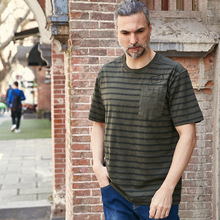 中老年男装圆领短袖t恤 条纹中年人短袖体恤衫夏有口袋爸爸装