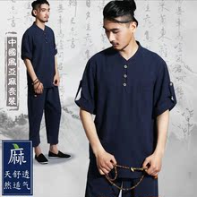 天天特价夏季亚麻男短袖套装中式禅修汉服男装居士服V领中国风套