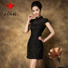 春夏新款女装改良气质优雅修身短款短袖蕾丝钉珠旗袍连衣裙女