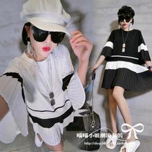 韩版2017夏装新款喇叭袖飞边显瘦中长款连衣裙小香风拼色打底裙女