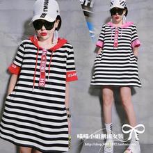 连帽纯棉条纹显瘦中长款连衣裙小香风加肥加大百搭打底裙上衣女潮