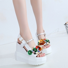 夏季坡跟凉鞋女震地王超高跟厚底松糕防水台性感露趾花朵增高凉拖