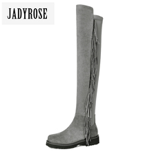JADYROSE秋冬过膝长靴女粗跟平底流苏弹力靴欧美鞋靴子高筒骑士靴