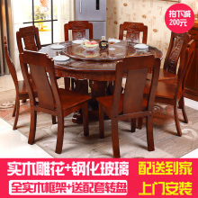 实木圆桌椅组合酒店大圆桌带转盘1.5/1.8米中式雕花仿古圆形餐桌
