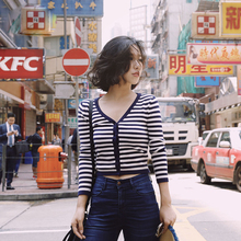 晚晚同款 春夏季新款打底长袖上衣修身条纹V领毛针织衫女开衫短款