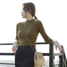 晚晚羊毛针织衫女打底衫套头春秋季套头毛衣短款长袖军绿色修身款