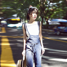 MS快时尚 薄款水洗蓝2016夏牛仔背带裤女长裤宽松高腰减龄细带