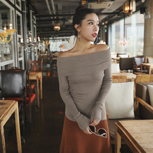 晚晚同款一字领露肩性感针织衫春秋季修身复古毛衣女套头长袖上衣