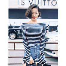 一字领修身显瘦棉质针织衫 性感条纹t恤女装长袖上衣服春秋季百搭