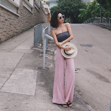 美国潮牌2017春夏雪纺拼接高腰复古粉色阔腿裤直筒裤晚晚同款
